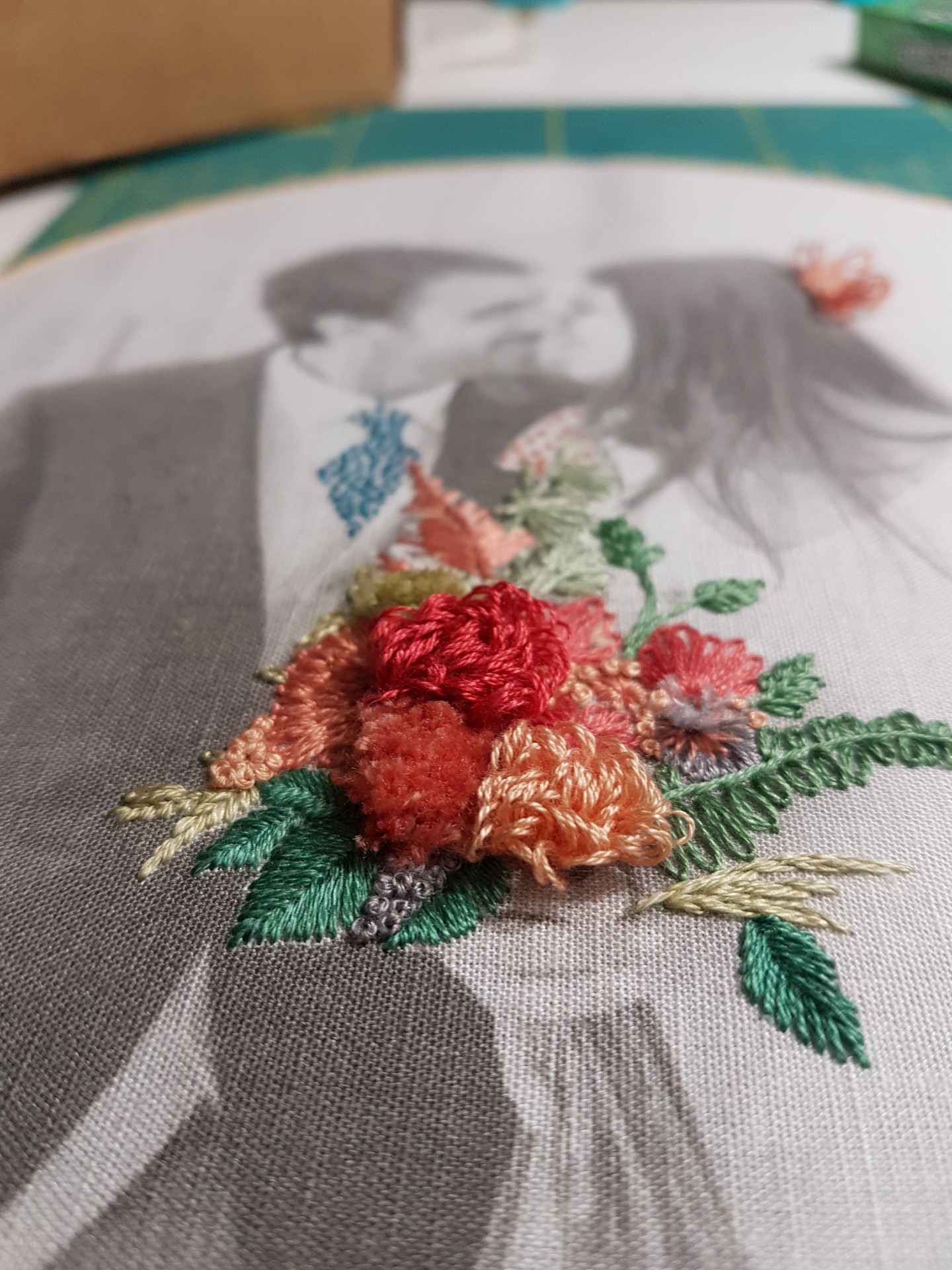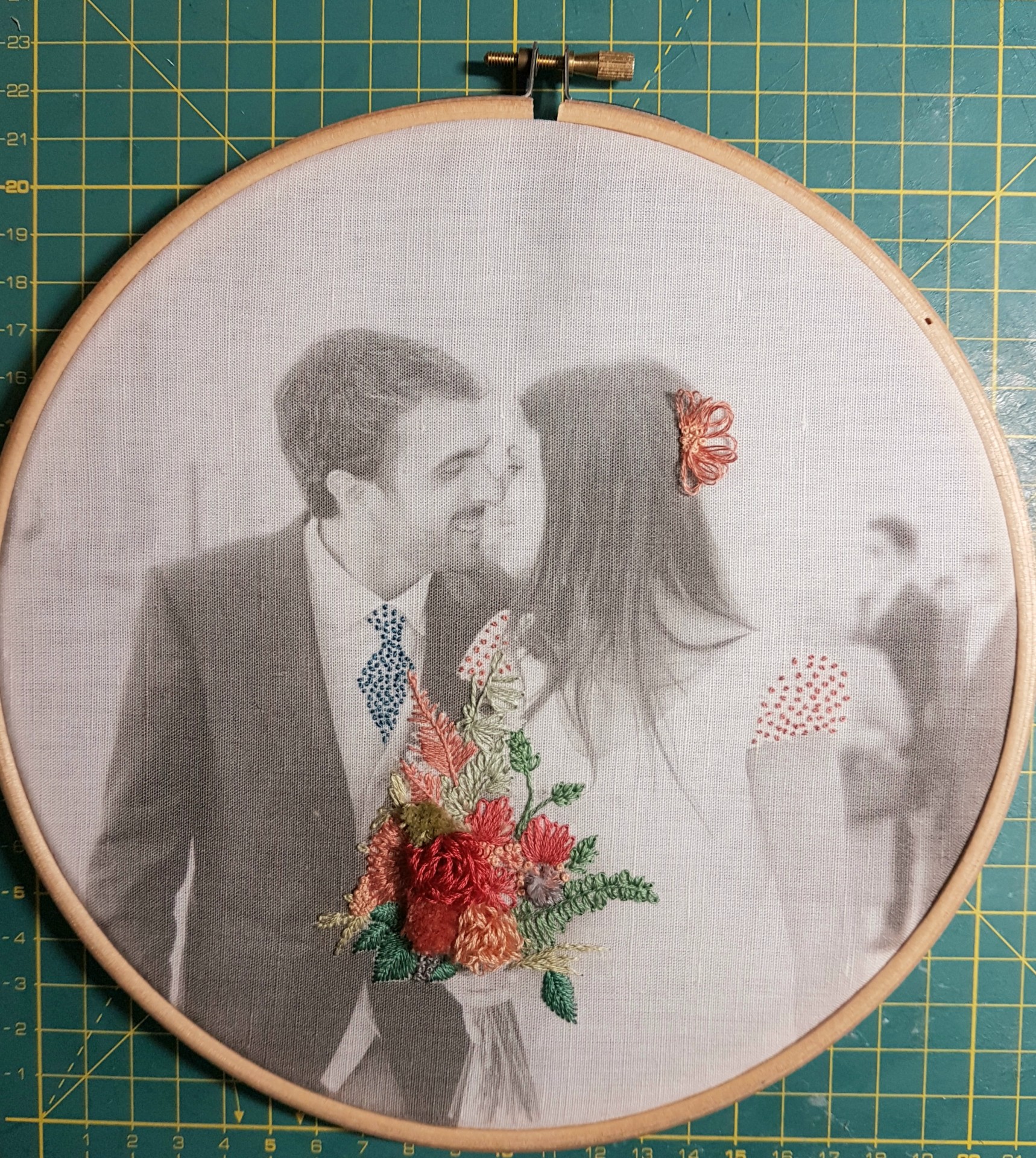 Tecido com imagem de casal e flores bordadas em aro de madeira sobre tapete de corte verde